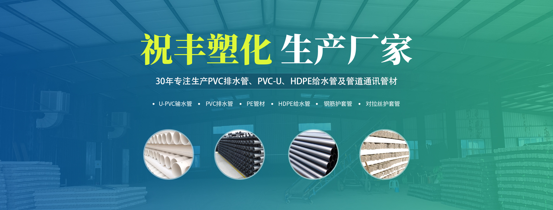 安陽(yáng)市祝豐塑化有限公司坐落在滑縣工業(yè)園區(qū),東臨大廣高速,西臨京珠高速,是鄭州、鶴壁、安陽(yáng)、濮陽(yáng)四個(gè)城市的輸紐,交通便利、環(huán)境優(yōu)美。 公司始建于八十年代,經(jīng)過(guò)二十余年的艱辛創(chuàng)業(yè),規(guī)模不斷壯大,由十多萬(wàn)元資產(chǎn)的小廠(chǎng),發(fā)展到現(xiàn)占地面積達(dá)一萬(wàn)多平,建筑面積一萬(wàn)平,資產(chǎn)2000多萬(wàn)元管材生產(chǎn)企業(yè)。公司生產(chǎn)PVC-U、PVC排水管、HDPE給水管、鋼筋護(hù)套管管道通訊管材等產(chǎn)品,廣泛用于農(nóng)田節(jié)水、高山引水、人畜用水、建筑、電力通訊等多種用途,品種齊全。為了滿(mǎn)足用戶(hù)需求,可承攬各種給水、節(jié)水、灌溉工程。“祝豐塑化”憑借強(qiáng)勁的實(shí)力,優(yōu)良的管理水平。“以質(zhì)量求生存,以信譽(yù)求發(fā)展”的原則全力以赴和大家共同塑造美好未來(lái)。..